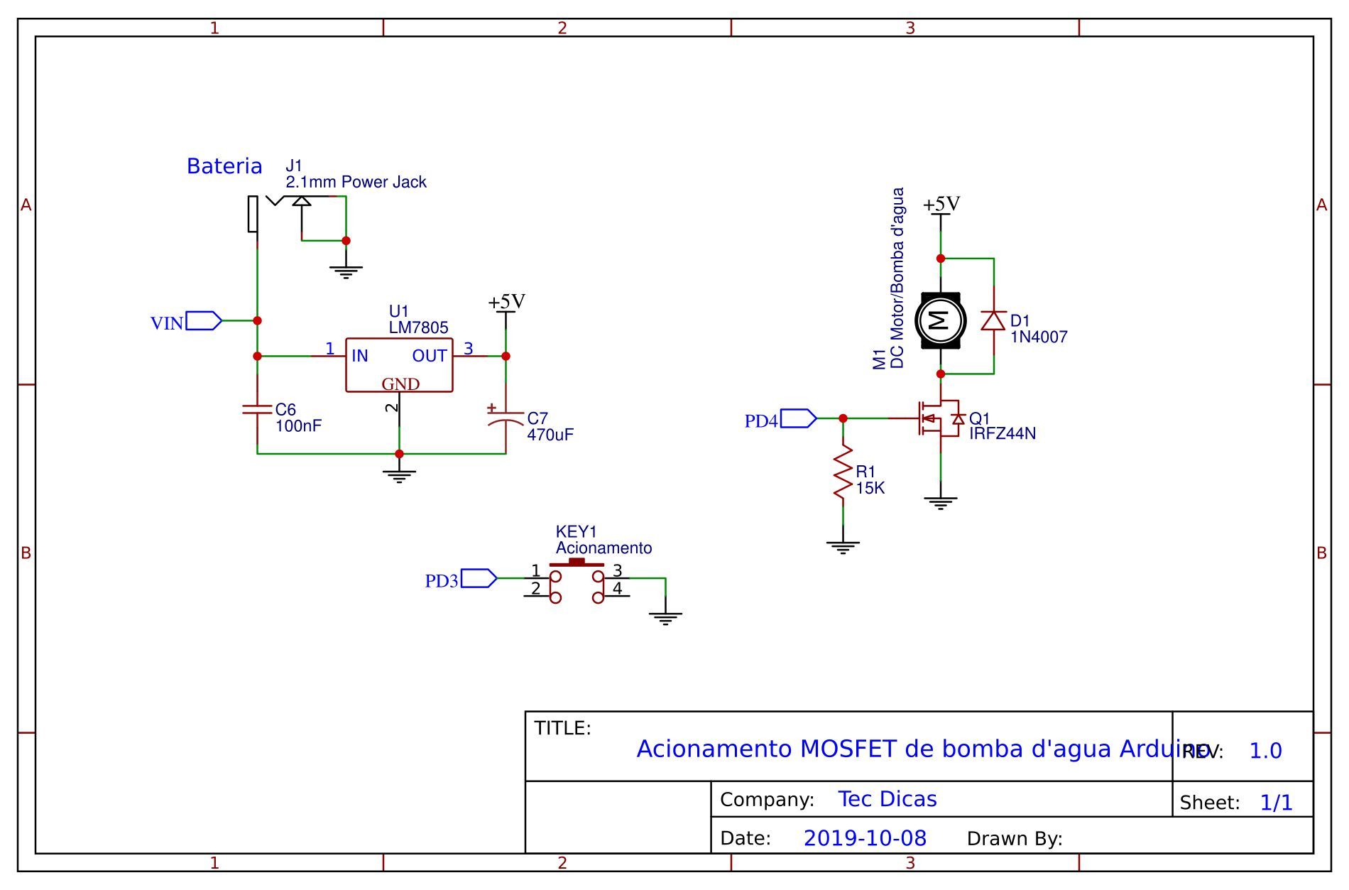 A estrutura elétrica de uma bomba d’água possui um motor DC para realizar o impulsionamento da água, e como já estudamos no artigo Controle de velocidade com driver MOSFET para motor DC, vimos que não podemos realizar as conexões do motor diretamente nas portas do Atmega328p, pois o motor é uma carga indutiva muito grande em que o sistema de proteção das portas do microcontrolador não suportam, além disso enfrentamos o fenômeno da indutância que tende ao infinito, e existem motores que são alimentados com tensões superiores que 5V.