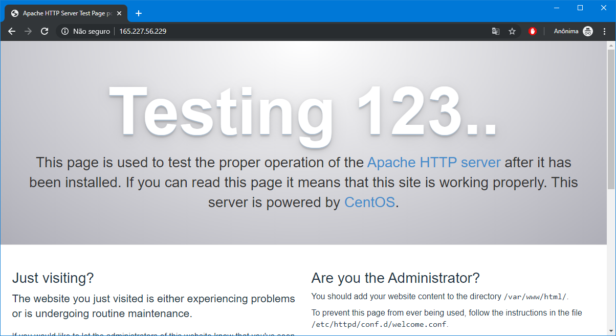 systemctl start httpd.service && systemctl enable httpd.servicePara testar basta iniciar o seu navegador e acessar o IP de seu servidor. Caso você veja uma tela similar à imagem abaixo, quer dizer que a instalação ocorreu sem nenhum problema.