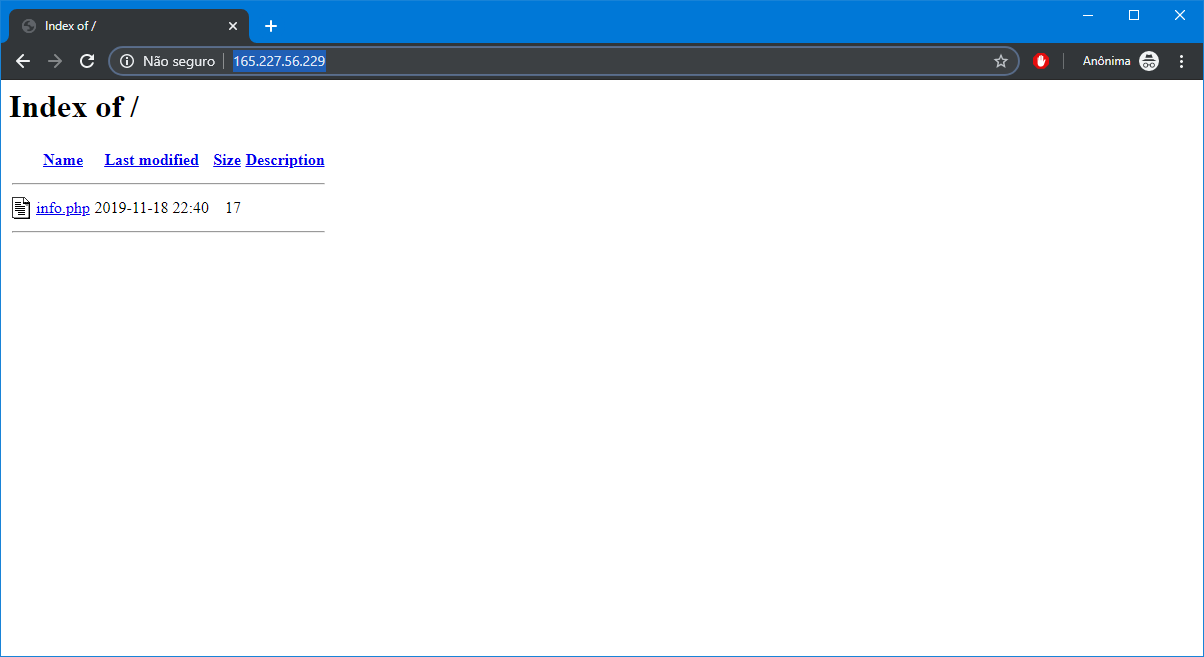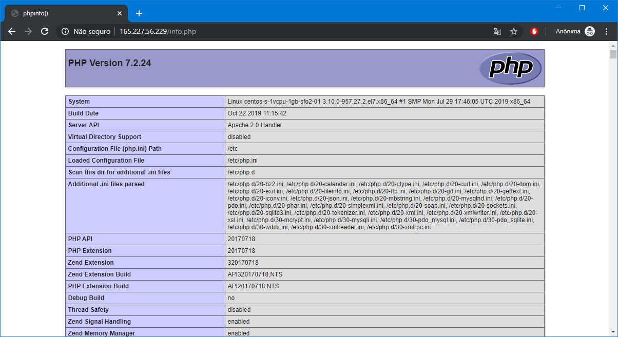 echo "<?php phpinfo();" >> /var/www/html/info.phpAcesse o arquivo “info.php” em seu servidor através do navegador, você deverá ver uma tela similar a esta.
