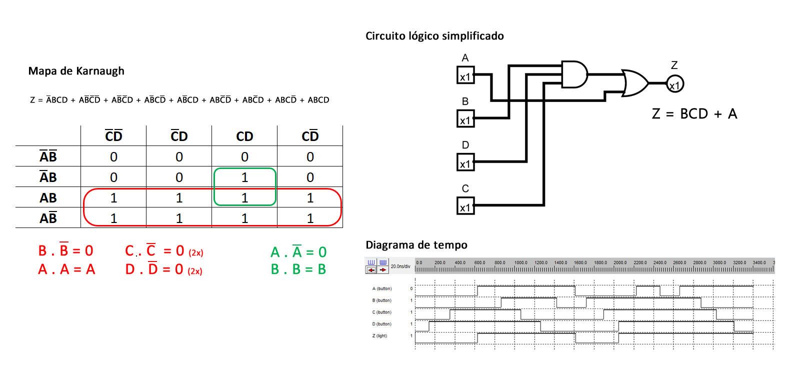 A expressão booleana simplificada “Z = BCD + A” ou “Z = A + BCD” possui somente duas portas lógicas, uma AND com três entradas e uma OR de duas entradas, sendo extremamente fácil de realizar uma simulação com software, como também ser implementada na prática com circuitos integrados e componentes eletrônicos comuns.