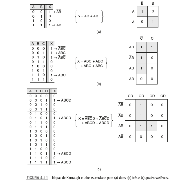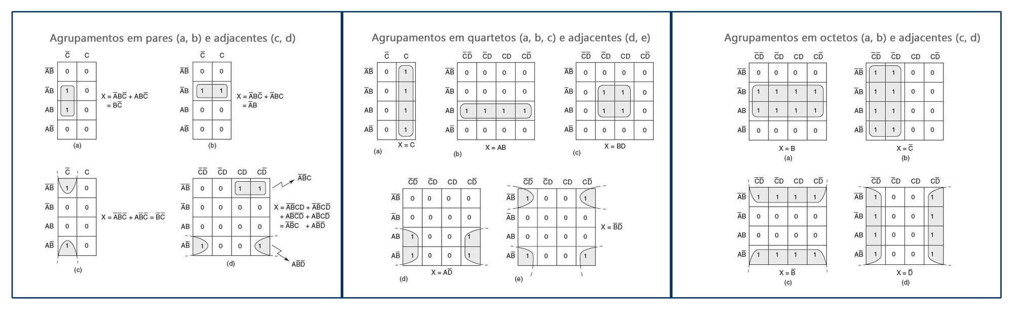 Quando uma variável aparece nas formas complementada e não complementada em um agrupamento, tal variável é eliminada da expressão. As variáveis que não se alteram para todos os quadros do agrupamento têm de permanecer na expressão final.