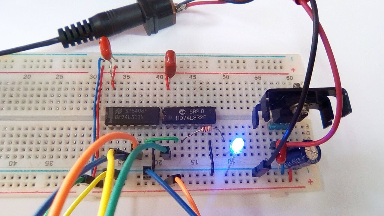 Os fios jumpers simulando as entradas A, B, C e D são inicialmente ligados ao GND, e ligando o circuito na bateria, o LED deverá permanecer apagado nesta condição. Alterne os fios para GND ou 5V conforme os níveis de entrada fornecidas pela tabela verdade para observar todas as possibilidades.