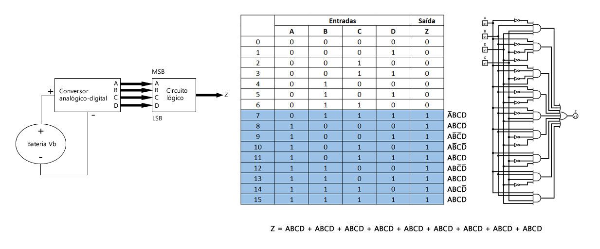 Veja a Figura 3, na qual um conversor analógico-digital está monitorando a tensão DC de uma bateria de 12V (Vb) de uma espaçonave em órbita. A saída do conversor é um número binário de quatro bits, ABCD, que corresponde à tensão da bateria em degraus de 1V, sendo a variável A o MSB (bit mais significativo). As saídas binárias do conversor são as entradas de um circuito que gera uma saída em nível ALTO, sempre que o valor binário for maior que 0110 = 6, ou seja, quando a tensão da bateria for maior que 6V. Projete esse circuito lógico de forma eficiente.