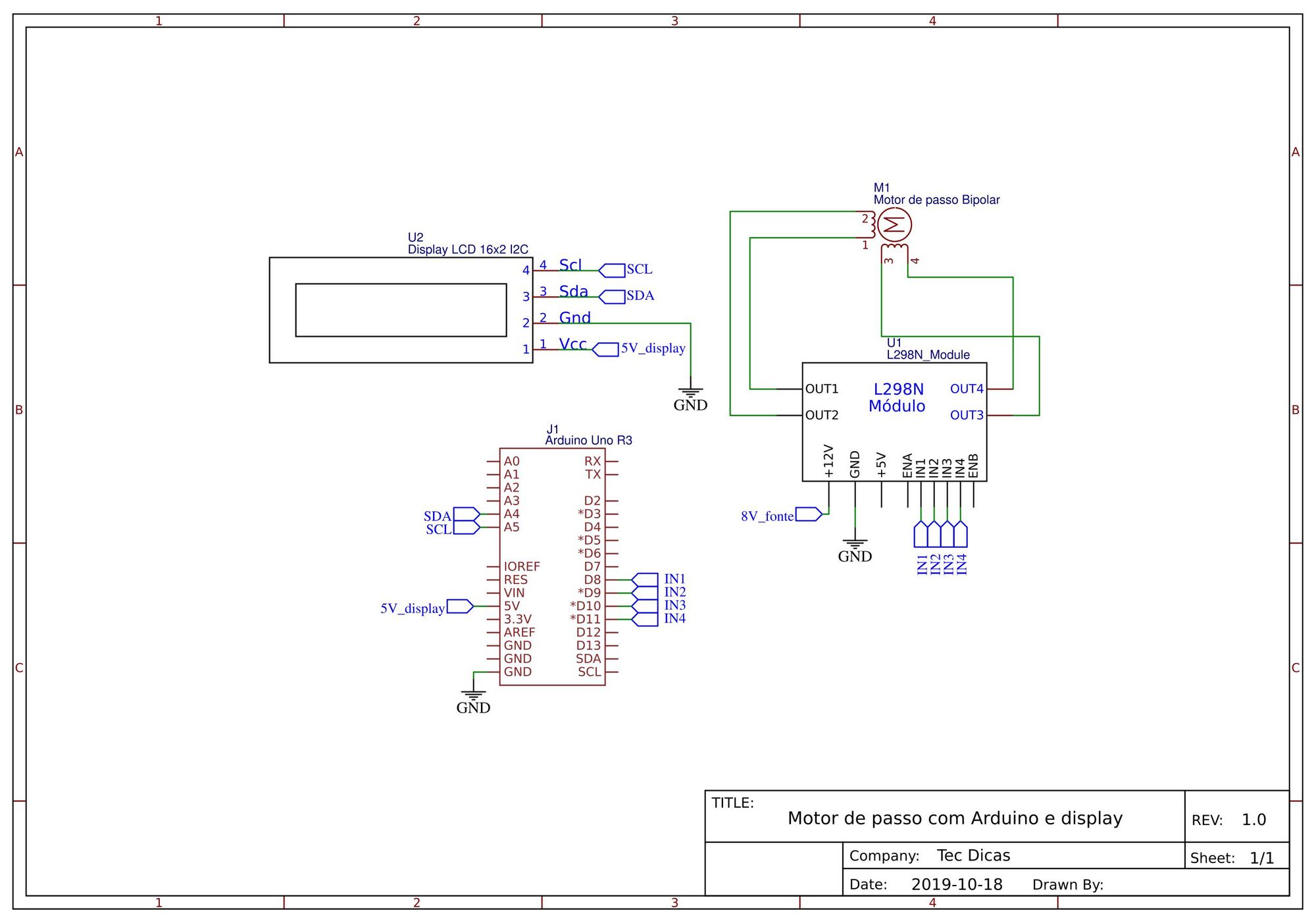 A Ponte H Dupla L298D será alimentada via borne (+12V e GND) com fonte de bancada setada em 8V, sendo a tensão recomendada do motor de passo utilizado, porém outros modelos podem apresentar tensões diferentes. A tensão 5V do módulo é fornecida pelo regulador de tensão LM7805 interno, onde o jumper é conectado. Nas inputs digitais foram utilizadas a IN1, IN2, IN3 e IN4 nas portas digitais do Arduino (8, 9, 10 e 11), onde os Enables A e B são conectados no 5V com os jumpers. Os fios do motor são ligados nos bornes OUT1/OUT2 e OUT3/OUT4. Para mais informações de montagem, configurações e especificações leia o artigo de Analisando e projetando drivers Ponte H.